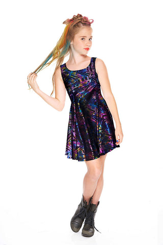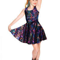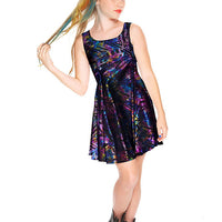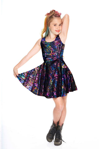 Our Colored Geometrics Skater Dress makes geometry fun! This metallic skater dress has an extremely flattering silhouette; tighter on the top and loose and flowy on the bottom. Made in the USA.