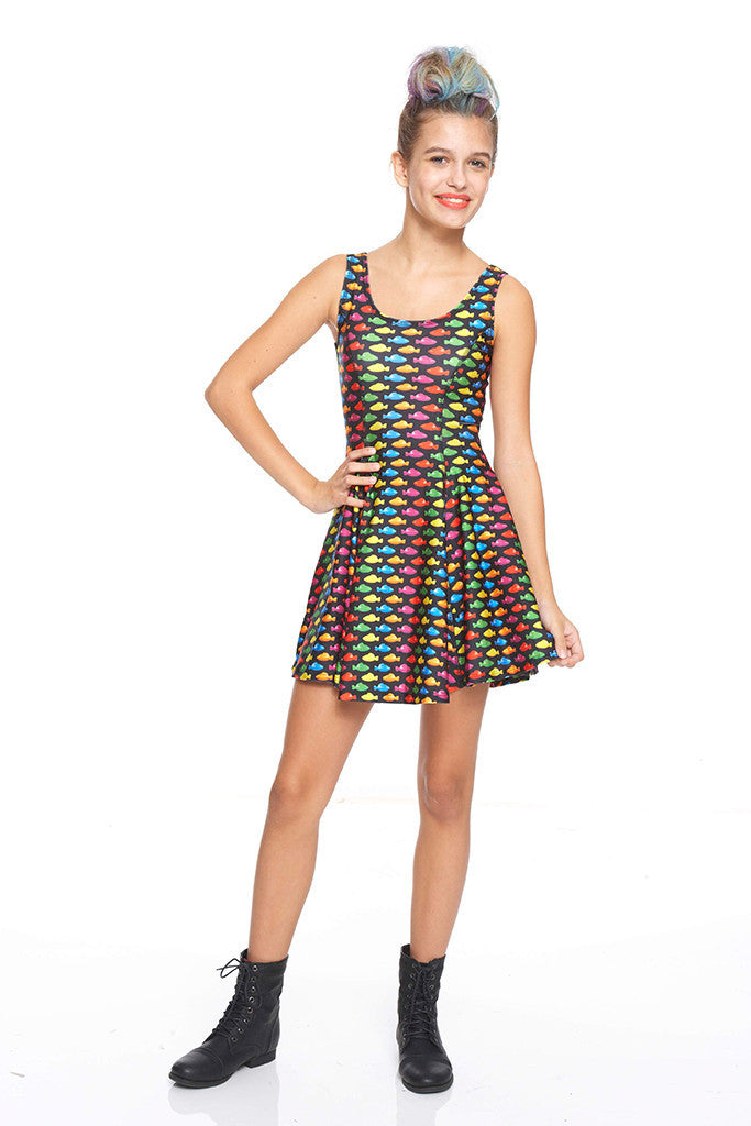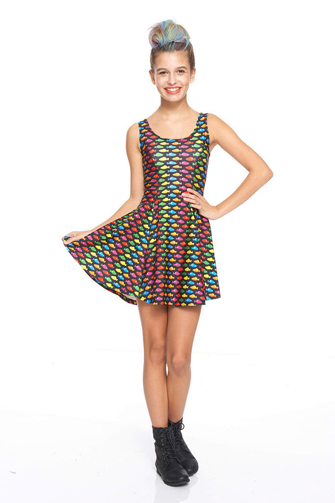 Erring on the conservative side (which says a lot for us), our Candy Crush Fishies Skater Dress have a black base with a colorful pop of little fishies throughout! What could be better than to have our very favorite booster, the fish, form lines right across your dress? Made in the USA