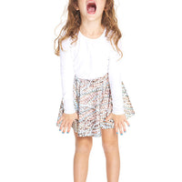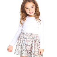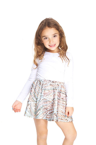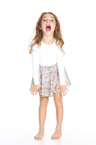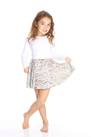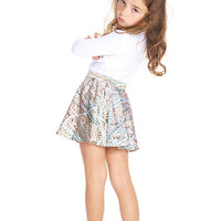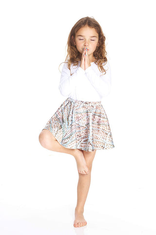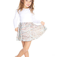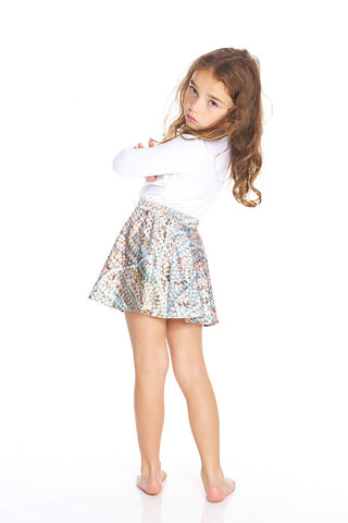 The world's her oyster! Our Nana's Pearls Skater Skirt is prim, polished, and printed with pearls. Inspired by bejeweled strands, this flared spandex skirt is perfect for playing dress up. Made in the USA
